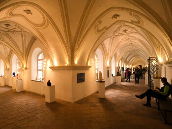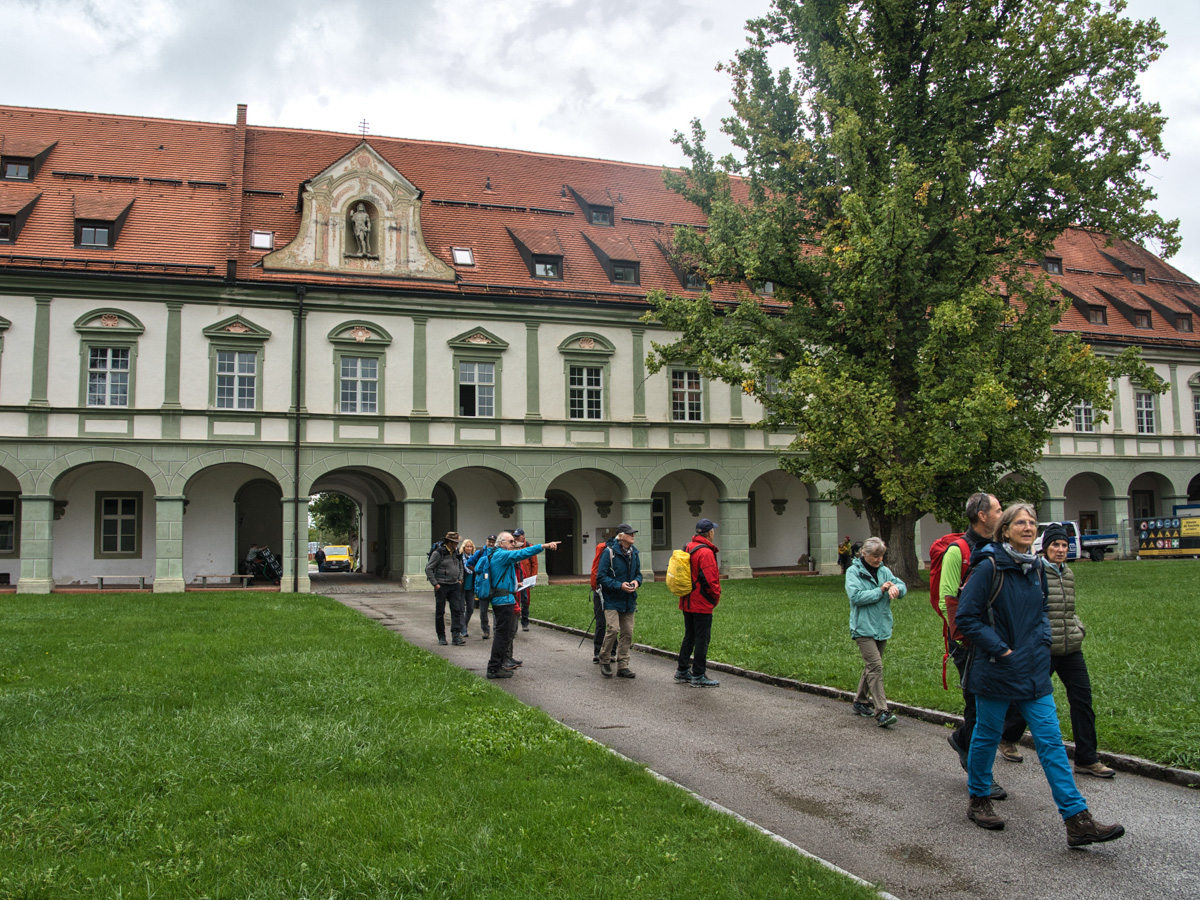 Durch tiefliegende Wolken musste die Wanderstrecke von Benediktbeuern zum Hotel etwas geändert werden. Zunächst gab es bei der Fahrt mit der Bundesbahn einige Aufregung. Die Zugbegleiterin stellte bei der Fahrscheinkontrolle die Gültigkeit unserer Gästekarte in Frage und drohte pro Person mit der Forderung von 60,00 € Beförderungsentgelt. Nach kurzer Diskussion wurde die Forderung jedoch zurückgenommen und wir konnten den Zug problemlos in Benediktbeuern verlassen und unsere Wanderung beginnen. Nach kurzer Wegstrecke erreichten wir das vor ca. 1.250 Jahren gegründete Kloster Benediktbeuern. Durch einen schweren Hagelsturm im August 2023 wurde innerhalb weniger Minuten die Hälfte aller Dächer auf dem Klostergelände zerstört. Bis zu fünf Tage lang drang Regen über die kaputten Dachflächen ein. In der Basilika St. Benedikt sind die Renovierungsarbeiten noch nicht abgeschlossen und man kann nur vom Vorraum einen Blick ins Innere werfen.