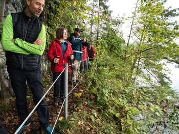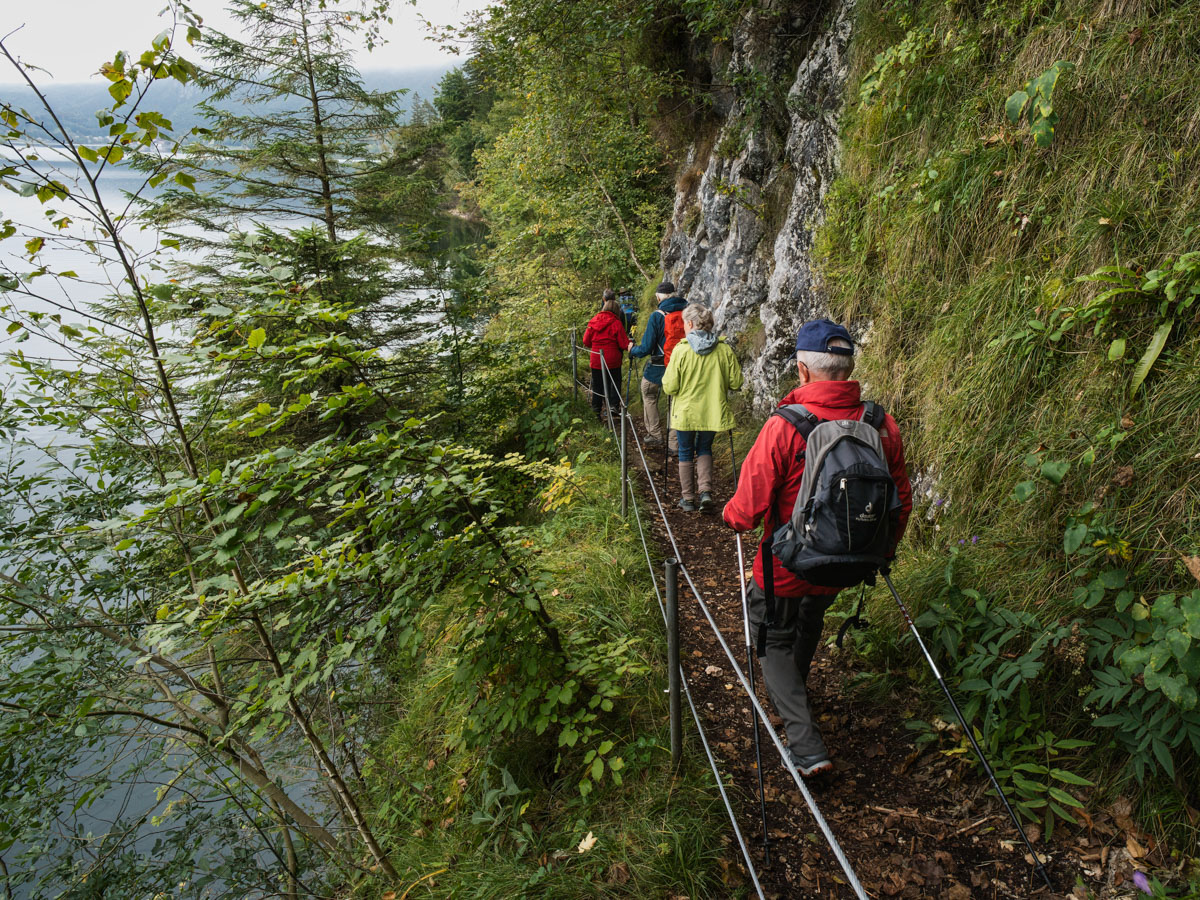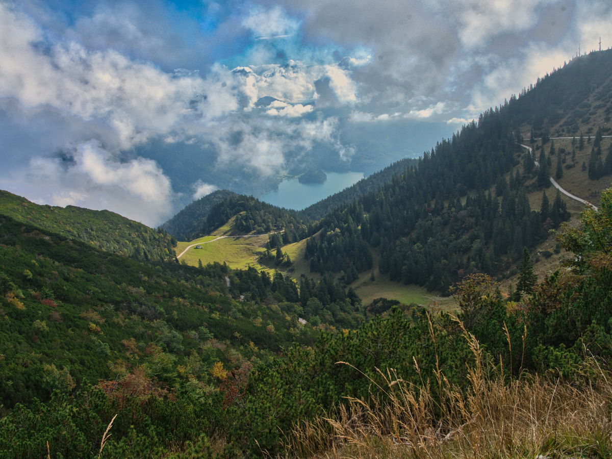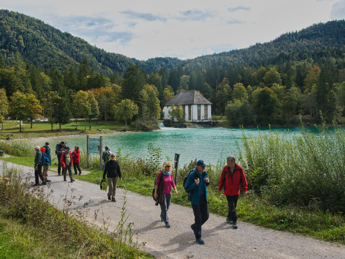 Nach dem Frühstück führte uns die letzte Wanderung vom Hotel vorbei am Walchenseekraftwerk zum Jocher Höhenweg und Felsweg. Nach dem Walchenseekraftwerk führte uns der Forstweg nach einem kurzen, steilen Anstieg auf Waldwegen in Richtung Schlehdorf. Über kleine Serpentinen, die wieder hinunter zum Kochelsee führen, konnten wir den Blick über das Loisach-Kochelsee-Moor, den Kochelsee und die Berge schweifen lassen.