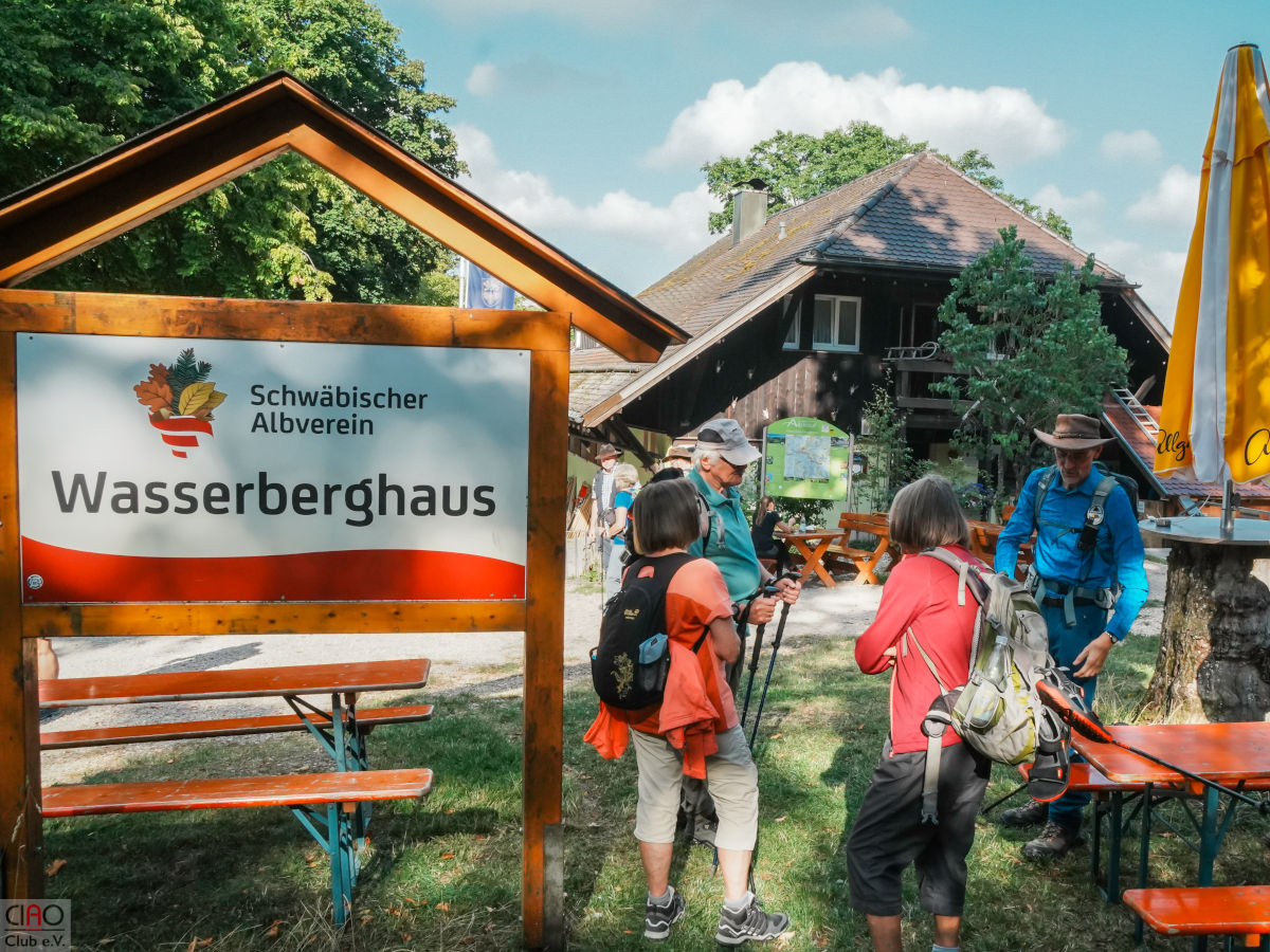 Der weitere Weg streifte die große Tagungsstätte der "Kirche im Aufbruch" und eine typische Wacholderweide mit Schafherde. Am südlichen Ende der Nordalb angelangt, gab es einen schönen Ausblick auf das Filstal mit Deggingen. Danach ging es über eine Teil der Nordalbrunde weiter, bevor der Abstieg ins Filstal Richtung Reichenbach im Täle erfolgte. Mittlerweile schien auch die Sonne. Der Orchideenpfad führte dann durch ein Naturschutzgebiet mit sommerlicher Flora und Fauna bis zum Haarbergkreuz (706m) und abschließend zum Wasserberghaus. Die Einkehr im "Biergarten" des Wanderheimes des Schwäbischen Albvereines tat allen nach dieser langen Wanderung gut. Abschließend ging es bergab zum Parkplatz Gairenbuckel, von wo die Teilnehmer etwas müde, aber gut gelaut, die Heimreise antraten.