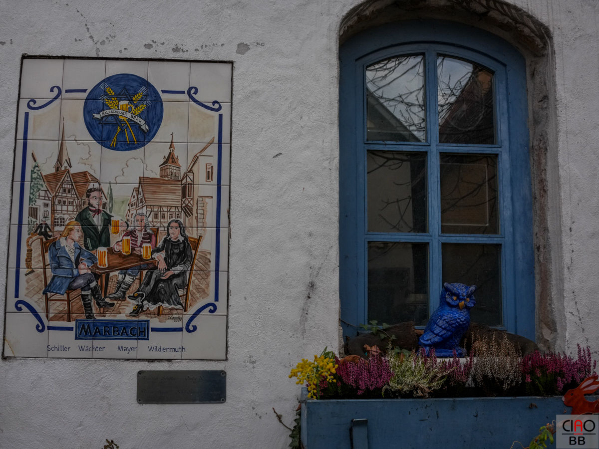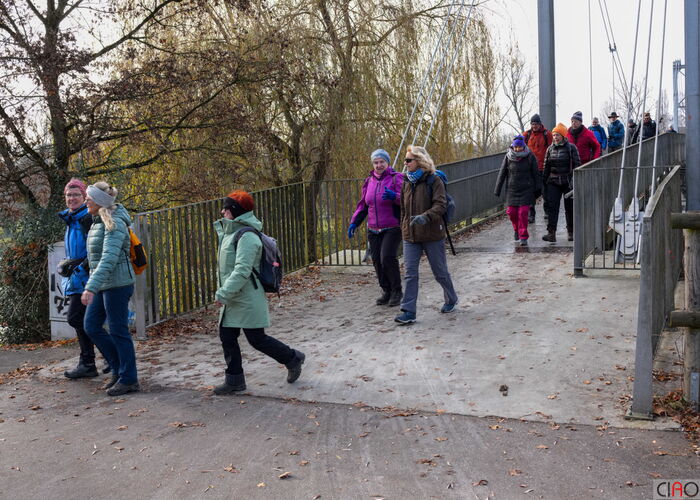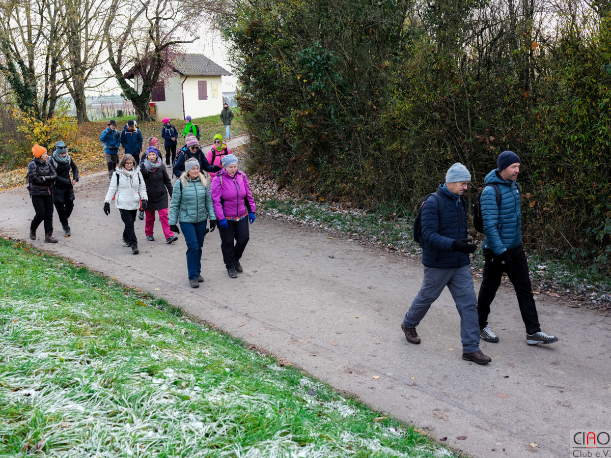 Letzen Sonntag wanderten wir von Murr aus über Benningen-Marbach-Steinheim zurück nach Murr. Es war eisig kalt bei minus Grade, aber trocken. So konnten wir pünktlich um 11.30 Uhr los laufen. Wir nahmen der Radweg entlang der Murr und nach ca. 1 Km überquerten wir eine sehr malerische Holzbrücke. Nach einem leichten Anstieg führte uns der Weg raus aus Murr, Richtung Benningen. Auf halber Höhe wanderten wir dann in den Weinbergen zum Kreisverkehr nach Benningen, liefen über die Neckarbrücke und im Tal entlang nach Marbach. Nach ca. 1,5 KM überquerten wir die Hängebrücke über den Neckar und an der großen Kreuzung liefen wir der Fußweg entlang der Stadtmauer, hoch in die Marbacher Altstadt.